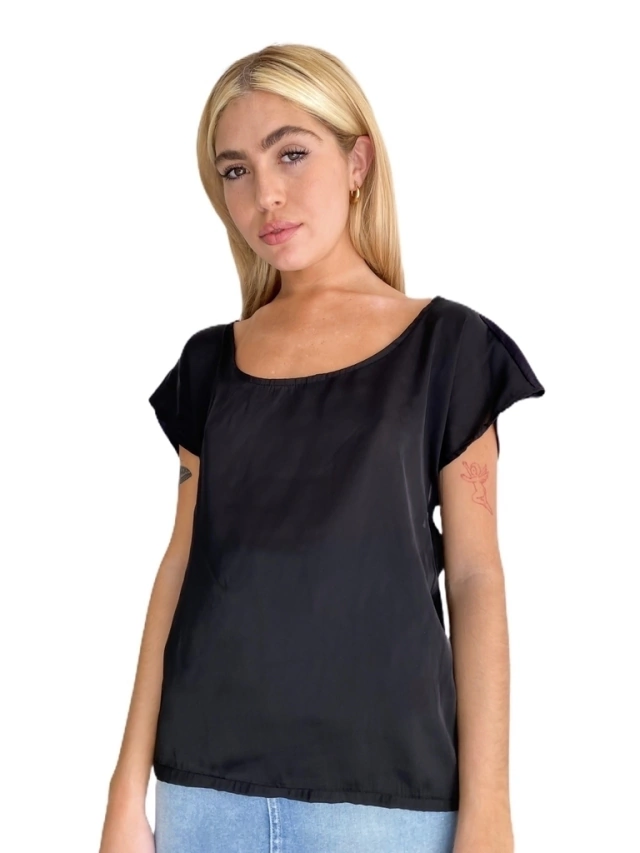 Remera de saten y jersey combinadas, frente en saten y espalda en jersey con moño.